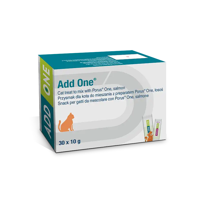 Add One to wyjątkowo apetyczny przysmak w formie pasty. Każda saszetka Add One zawiera świeżą porcję kremowego łososia. Koty z przyjemnością jedzą go prosto z saszetki jako codzienną przekąskę. Można go również użyć w celu ułatwienia podawania preparatów czy suplementów. Jest niskokaloryczny (mniej niż 10 kalorii w saszetce). Stworzony we współpracy z lekarzami weterynarii.