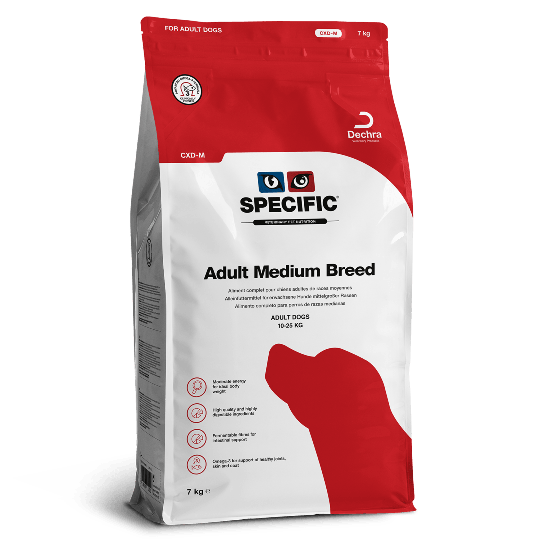 SPECIFIC™ Adult Medium Breed CXD-M to pełnoporcjowa i w pełni zbilansowana karma sucha dla psów dorosłych ras średnich w wieku do 7 lat, o masie ciała 10-25 kg.