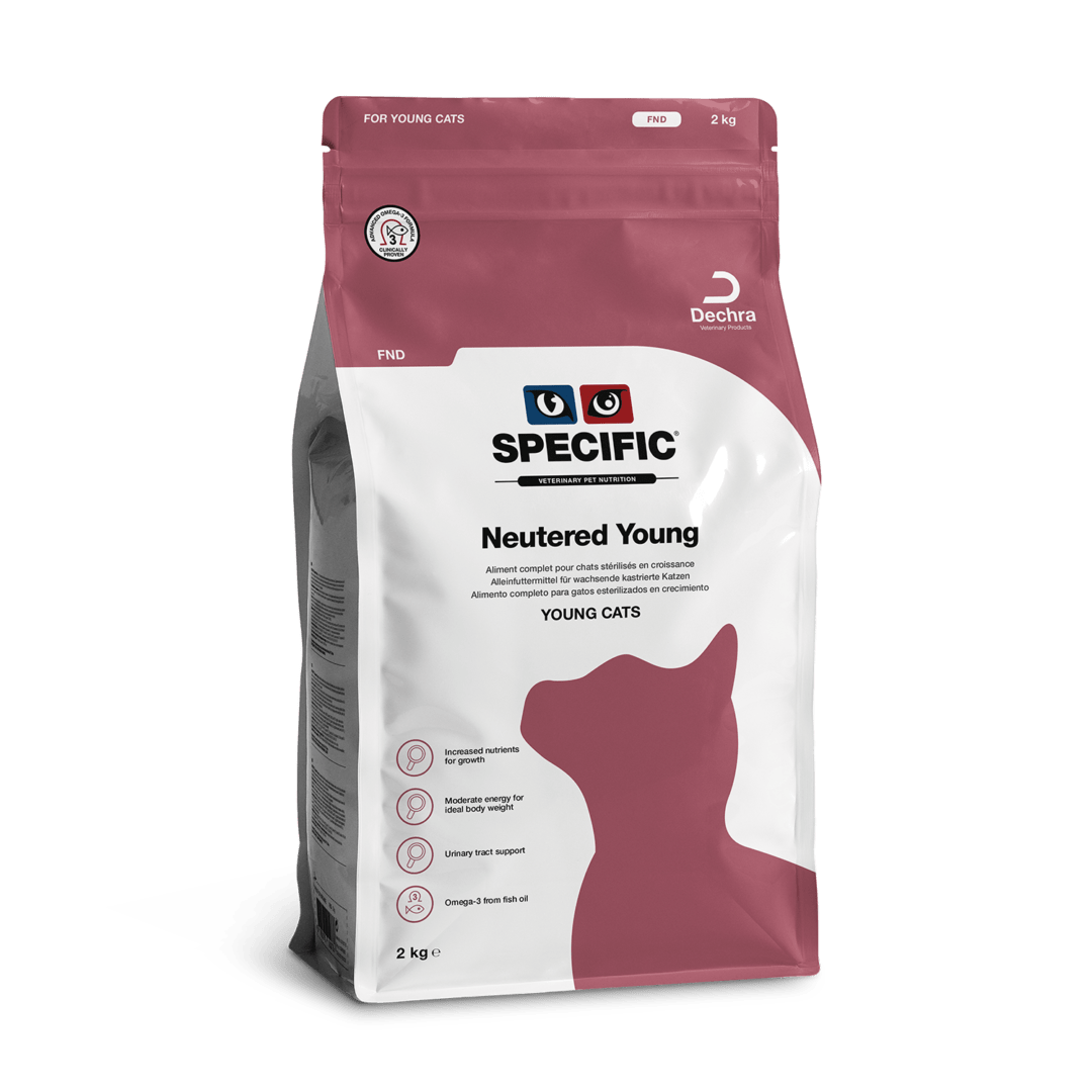 SPECIFIC™ Neutered Young FND to pełnoporcjowa i w pełni zbilansowana karma sucha dla kociąt i młodych kotów po zabiegu kastracji i sterylizacji.
