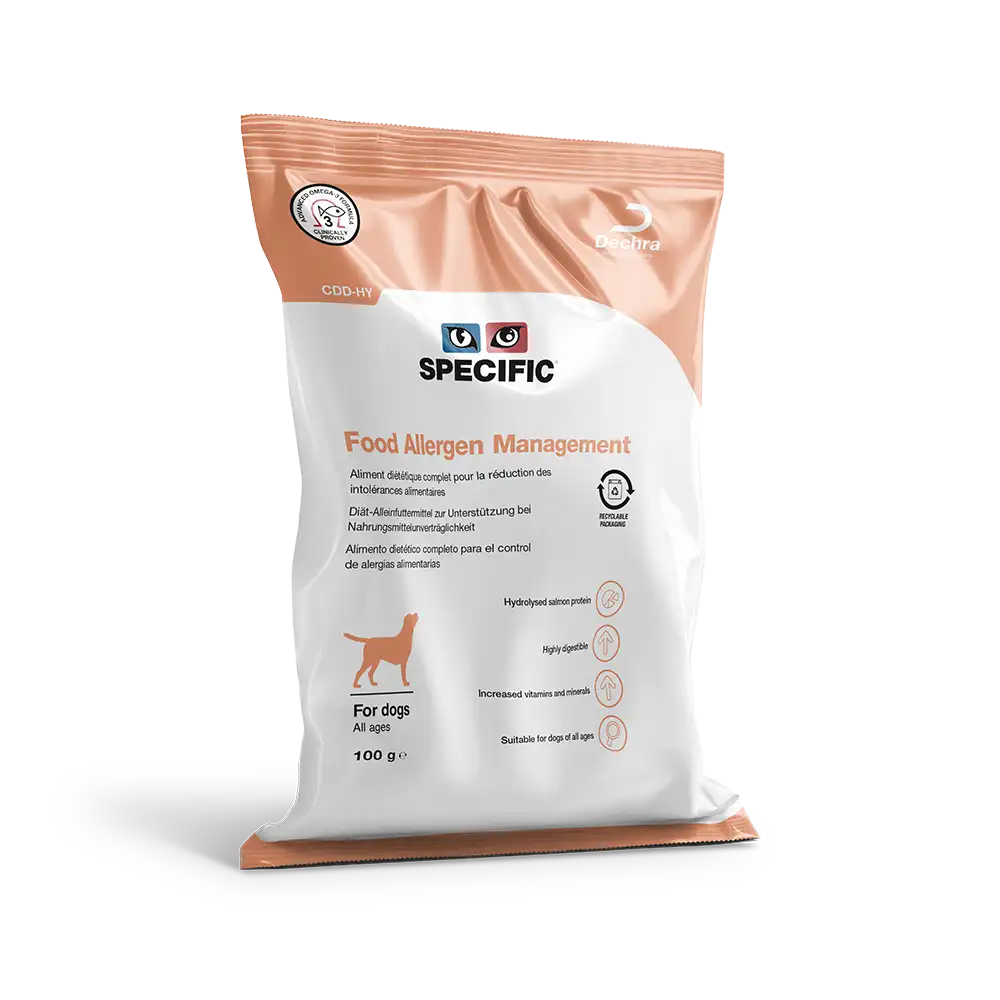 SPECIFIC™ Food Allergen Management CDD-HY to pełnoporcjowa i w pełni zbilansowana, hydrolizowana karma sucha dla psów w każdym wieku, w tym szczeniąt.