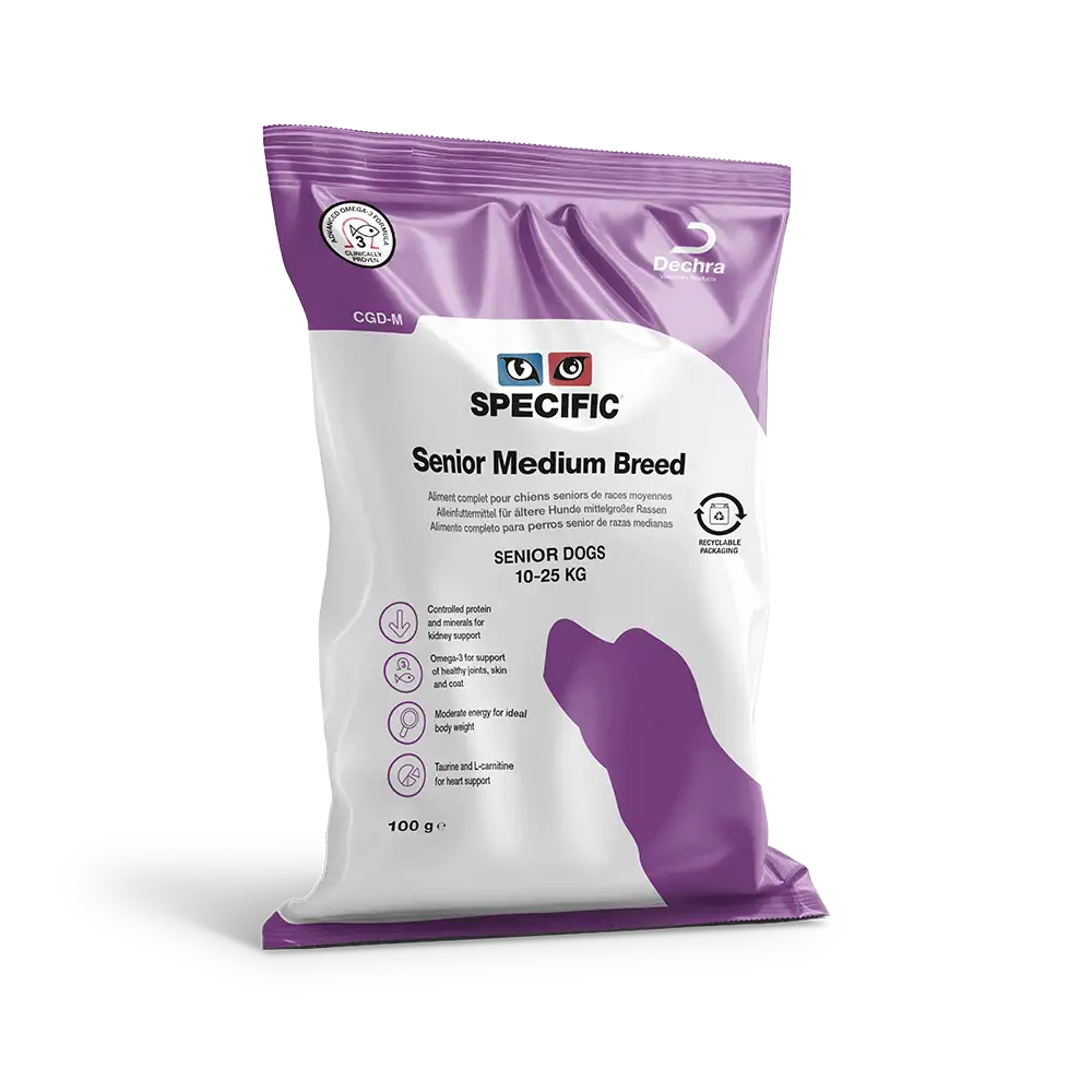 SPECIFIC™ Senior Medium Breed CGD-M to pełnoporcjowa i w pełni zbilansowana karma sucha dla psów starszych ras średnich w wieku powyżej 7 lat, o masie ciała 10-25 kg.